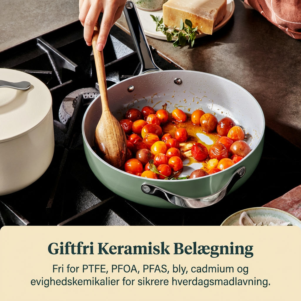 Vores kogegrej er belagt med 100% keramik, fremstillet af naturlige mineraler uden skadelige kemikalier. Du får stadig det non-stick resultat du kender – men uden at gå på kompromis med din families sundhed.